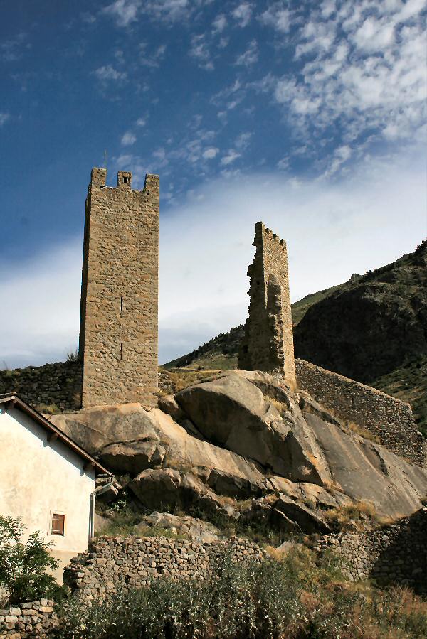 vues à gauche sur le hameau de Carol avec ses deux tours en ruine.